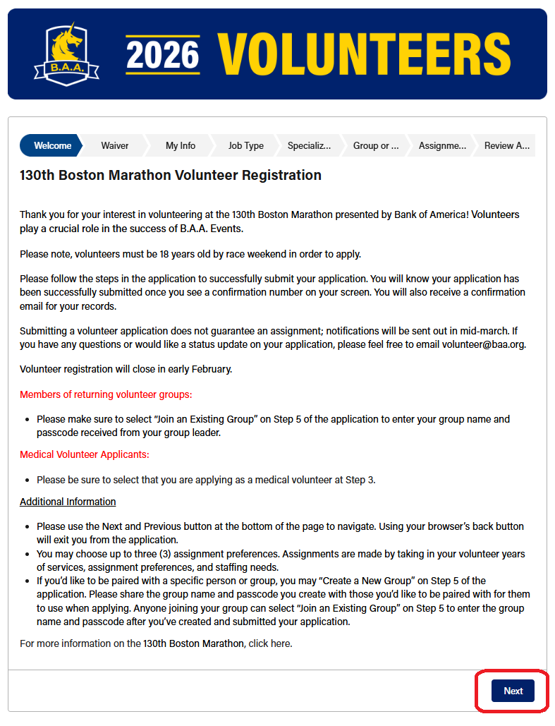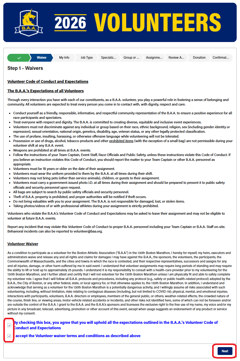 Review the code of conduct and waiver on the next page and if you agree to the terms, check the accept/agree boxes in the bottom left of the page. Once checked, click the "Next" button in the lower right of the page