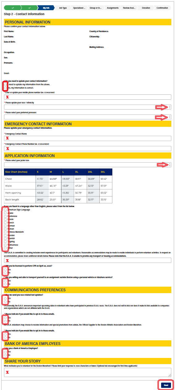 At the top of the next page, confirm your information, then complete any fields that require updates. Once all required fields are filled in, click "Next" in the lower right.