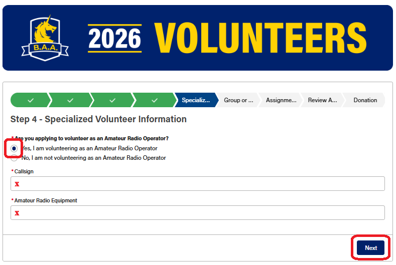 On the next page, select "Yes, I am an Amateur Radio Operator" and enter your FCC Callsign and the equipment you have available for race day, then click "Next" in the lower right