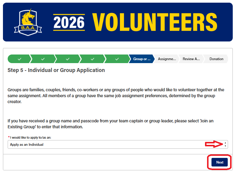 On the next page, select "Apply as an Individual" from the drop down list and then click "Next" in the lower right