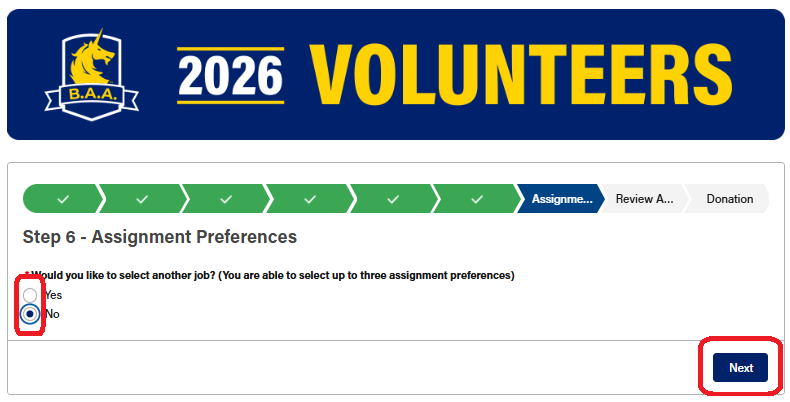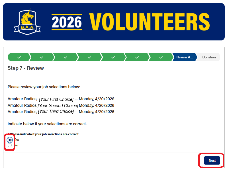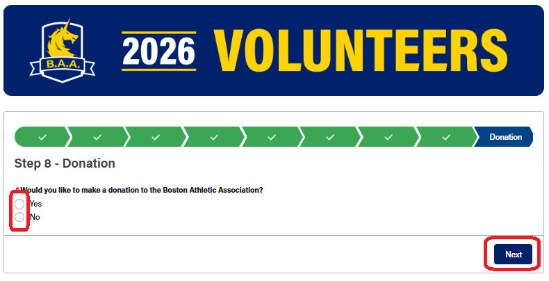 The next page gives you the opportunity to make a donation to the Boston Athletic Association. If you'd like to make a donation, select "yes," click "Next," and follow the prompts. If not, select "No," and click "Next."