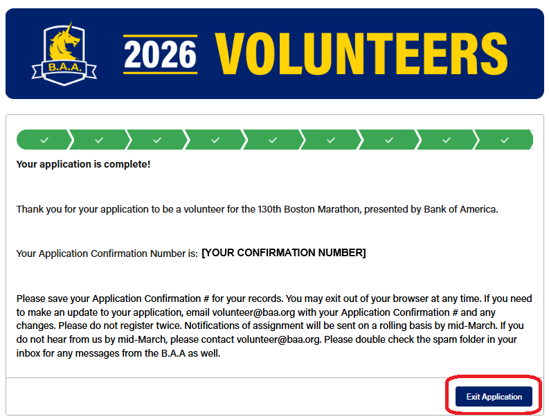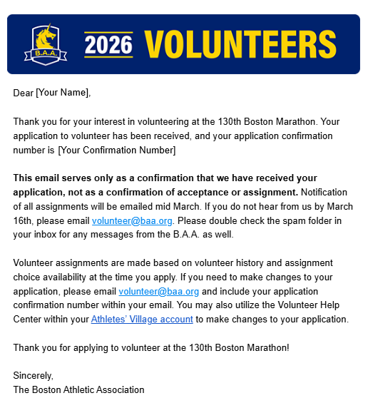 Your confirmation email will come from "volunteer@baa.org" and will contain your application confirmation number. Please don't delete this email!